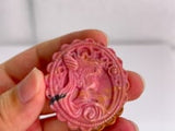 Discover the enchanting beauty of our hand-carved Rhodonite Magical Girl Cameo. This exquisite piece showcases delicate artistry on premium pink rhodonite, measuring 40.1mm (1.58") in diameter and 9.3mm (0.37") in thickness.
