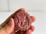 This stunning Rhodonite carving showcases a beautiful magical girl pattern, meticulously crafted to enhance the stone's natural pink hues and golden inclusions. Each piece measures approximately 40mm (1.57") in diameter and 8.6mm (0.34") in thickness, perfect as a collectible or healing tool.