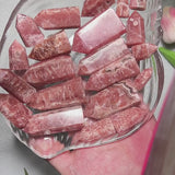 Our Natural Mini Rhodochrosite Tower weighs approximately 5g to 60g, with sizes ranging from 20mm to 60mm. Each tower features beautiful pink and white patterns, symbolizing love and emotional healing. Ideal for energy work, meditation, or as a decorative accent. As a wholesaler, we offer wholesale prices for all orders, even for single pieces.